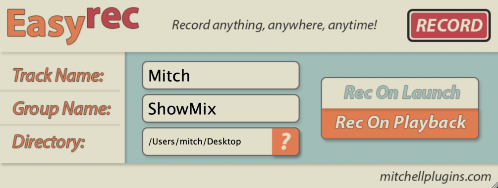 - Will NEVER record over existing audio; Uses Track and Group name fields to generate unique filenames.
